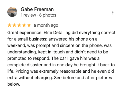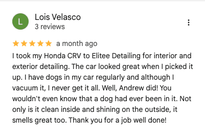 "My car looked as good as day I drove it off the lot. Andrew arrived punctional and paid meticulous attention to every detail, from the exterior wash to the interior vacuuming. He didn't miss a spot, leaving my car spotless and smelling fresh and clean!" - Christina P.